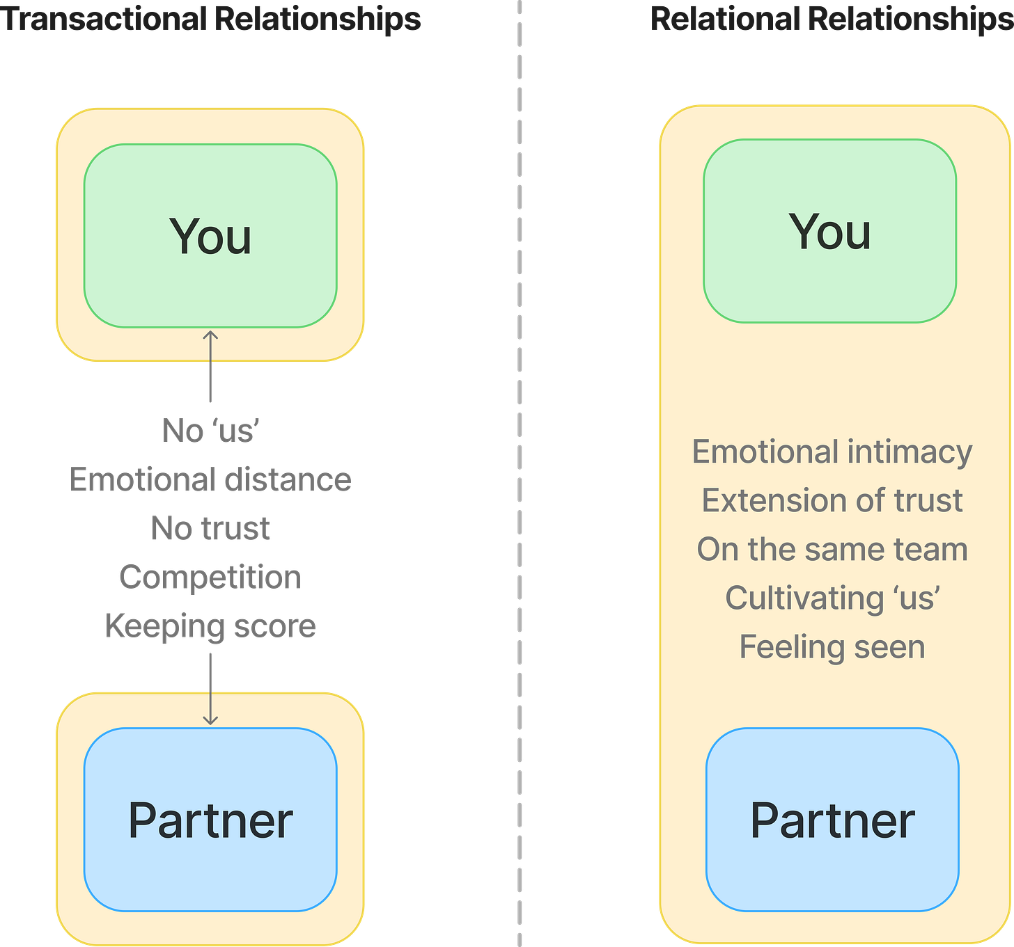 The deeper story is that transactional relationships enable people to maintain perceived control of their own life, whereas real relationships require you to let go, in a sense, of control. In a real relationship, there’s compromise, growth, change, and a prioritization of ‘us’ over ‘me’.